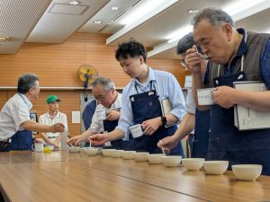 審査では、農業研究センター茶業研究所の中山所長を審査長とした6名の審査員が、茶葉の形状や熱湯を注いだ時の香り、色、味を審査しました。